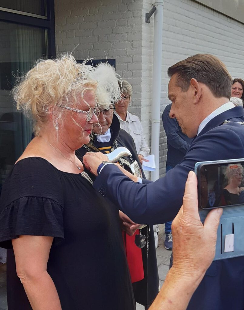 Dit hele seizoen heeft Jacquelien Pinxten hem bijgestaan als zijn koningin en als uit dankbaarheid heeft ze uit handen van de Burgemeester, de speld voor Lid van Verdienste mogen ontvangen.